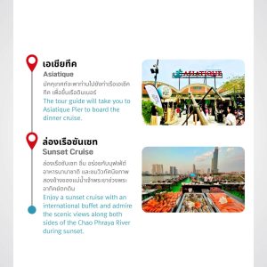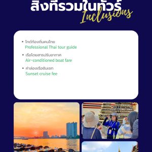 ดินเนอร์ชมพระอาทิตย์ตกบนเรือสำราญหรูริมแม่น้ำเจ้าพระยา ล่องเรือผ่านแลนด์มาร์กที่มีชื่อเสียง เช่น สะพานพระรามที่ 1, วัดกัลยาณมิตรวรมหาวิหาร (วัดพระใหญ่), วัดอรุณราชวราราม (วัดอรุณ), พระบรมมหาราชวัง ฯลฯ